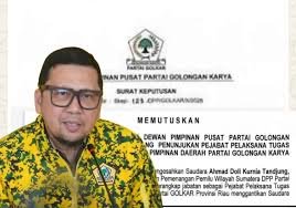 ” Menunjuk dan mengesahkan Saudara Ahmad Doli Kurnia Tandjung Wakil Ketua Umum Pemenangan Pemilu Wilayah Sumatera DPP Partai Golkar untuk merangkap jabatan sebagai Pelaksana Tugas (Plt) Ketua DPD Partai Golkar Provinsi Sumatera Utara menggantikan Saudara Musa Rajeckshah,” tulis Bahlil dalam surat keputusannya seperti dikutip pada Kamis (18/12/2025)