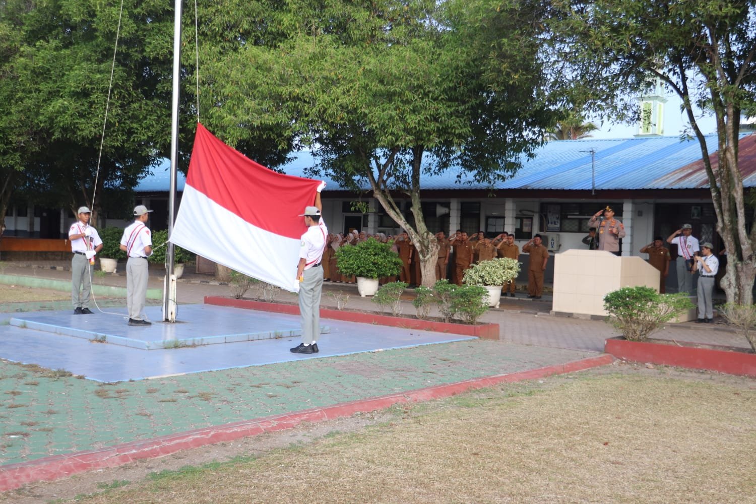 Upacara berlangsung dengan tertib dan khidmat, diawali dengan laporan, pengibaran bendera Merah Putih, serta pembacaan UUD 1945.