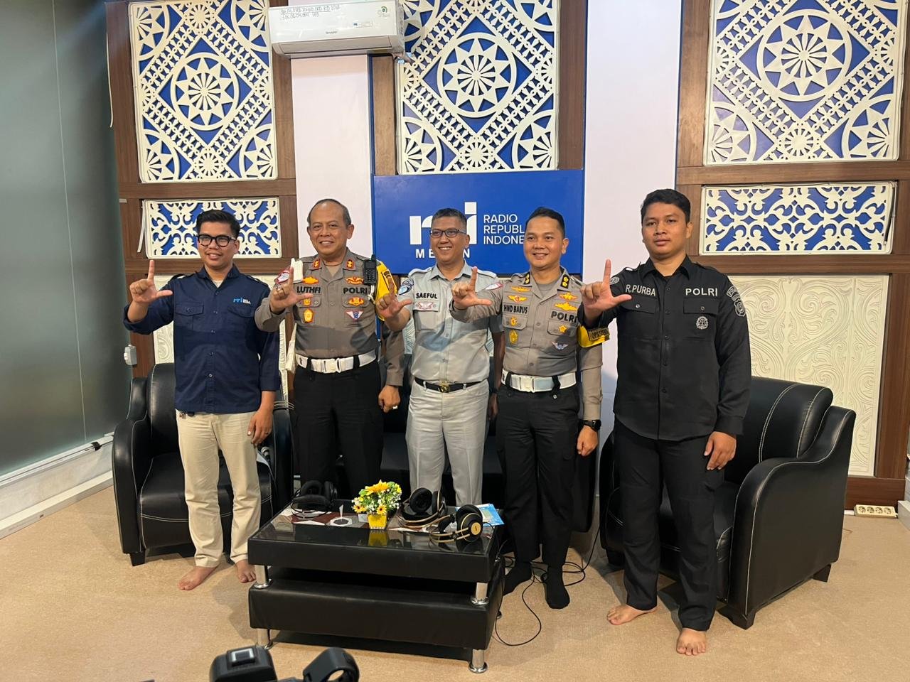Wadir Lantas Poldasu AKBP Lutfhi (dua dari kiri), Kasubdit Kamsel Ditlantas Poldasu AKBP Hendri Nupia Dinka Barus (dua dari kanan) dan Kepala Bagian Operasional Jasa Raharja Sumut Rd Saeful Kamal Apandi (tengah) bersama personil Bidhumas dan reporter RRI. (foto : dok)