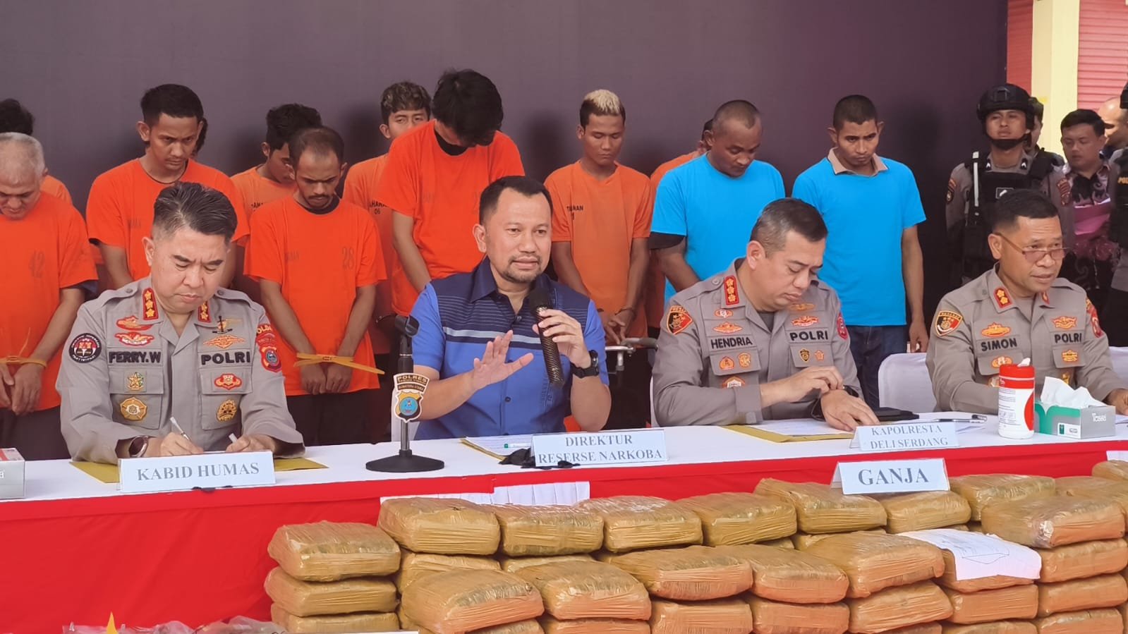 Paparan bersama Dirresnarkoba Polda Sumut Kombes Jean Calvijn Simanjuntak, diikuti Kapolresta Deliserdang Kombes Hendria Lesmana, Kapolres Serdangbedagai AKBP Jhon Sitepu, serta Kapolres Tebingtinggi AKBP Simon Paulus Sinulingga.