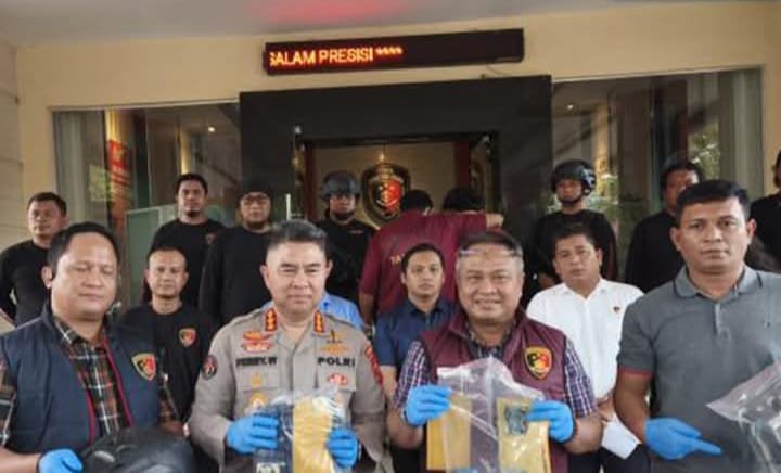 Dirreskrimum Poldasu KOmbes Ricko didampingi Kabid Hunas Kombes Ferry dan Kasubdit Jatanras Kompol Jamak Purba saat ekspos pada pers. (foto : dok)