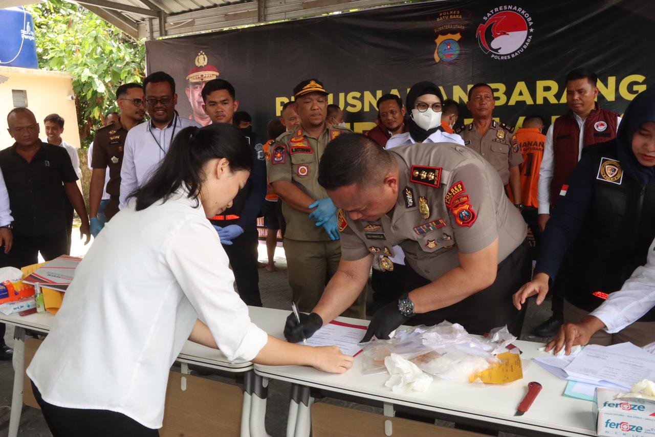 Barang bukti yang dimusnahkan berasal dari kasus dengan nomor LP/A/272/XII/2025, LP/A/273/XII/2025, LP/A/40/II/2026, dan LP/A/56/III/2026, dengan tersangka yang berasal dari berbagai kecamatan di Kabupaten Batu Bara serta satu tersangka dari Kabupaten Asahan. Selain shabu, juga ditemukan bukti lain seperti senjata airsoft gun merk Pietro Beretta, pil MDMA/Ekstasi warna merah hijau, serta beberapa unit handphone dan mobil.