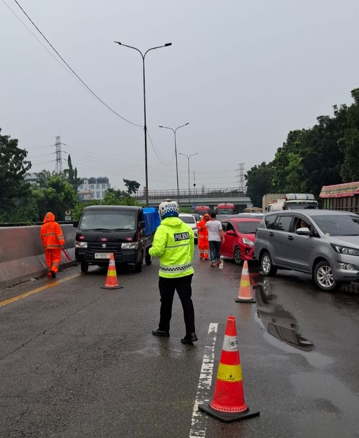 ” Contra flow ini kami lakukan untuk memastikan arus lalu lintas tetap berjalan meski terbatas, serta untuk mencegah penumpukan kendaraan di titik banjir. Petugas juga disiagakan untuk memastikan pengguna jalan tetap aman saat melintas,” tambahnya.