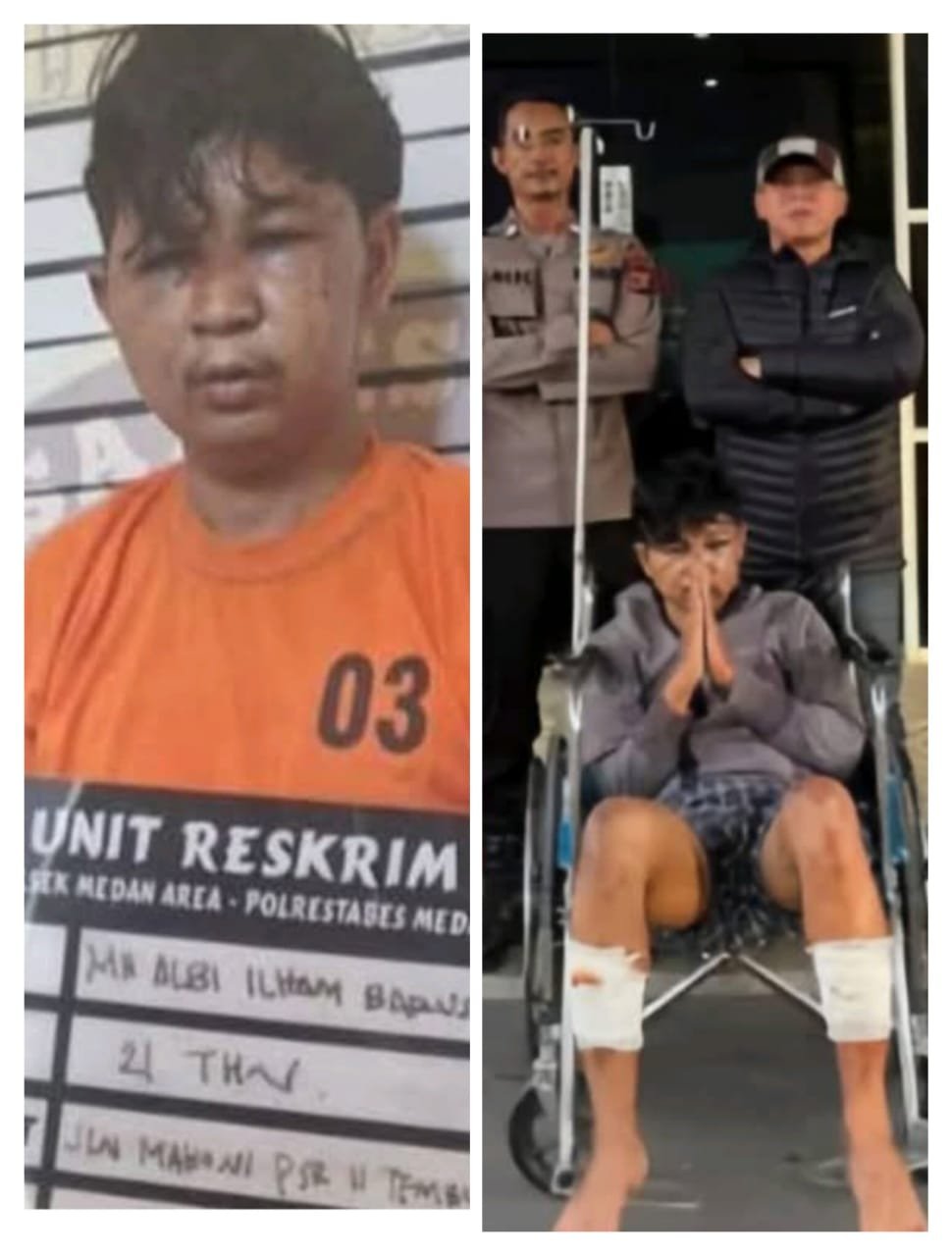 BLOKERITA.COM – Tersangka spesialis begal bernama M Albhi Ilham Barus (21) telah roboh akibat ditembak petugas unit Reskrim Polsek Medan Area dibagian kedua kakinya. Warga yang tinggal di Jalan Mahoni, Pasar II Tembung itu terkena timah panas.